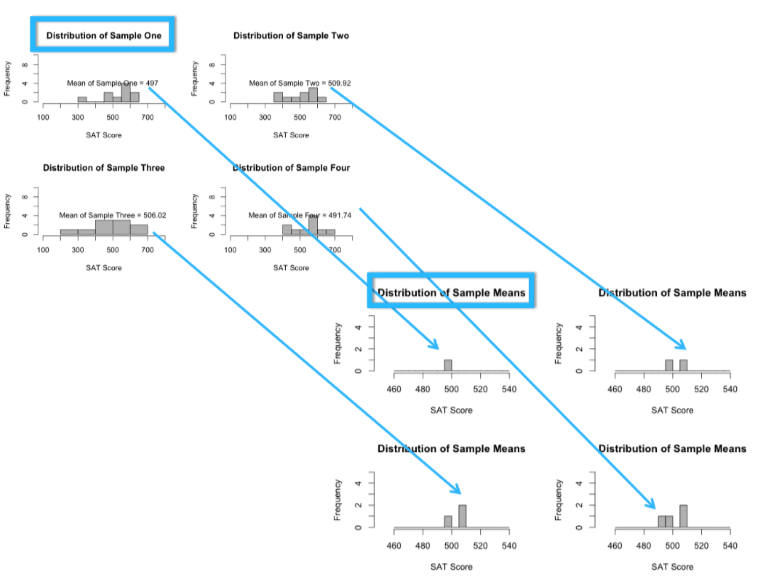Then, you do it again with a new sample of 10 students. You might get a mean of 480 this time.