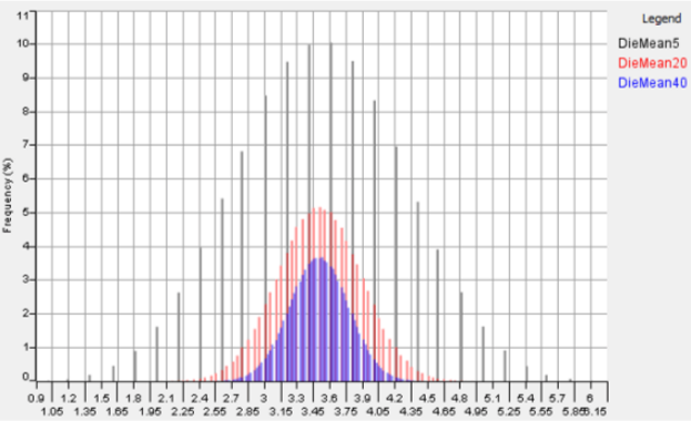 To prove the thrid point let’s take a uniform distribution, in the image below times for each sample size have been drawn and their mean plotted. We’d expect the average to be . The sampling distributions of the means center on this value. Just as the central limit theorem predicts, as we increase the sample size, the sampling distributions more closely approximate a normal distribution and have a tighter spread of values.