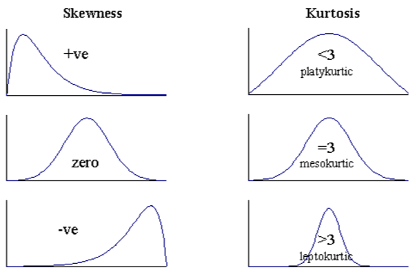 Kurtosis: Kurtosis is a measure of the “peaked ness”. Distributions with higher peaks have positive kurtosis and vice-versa